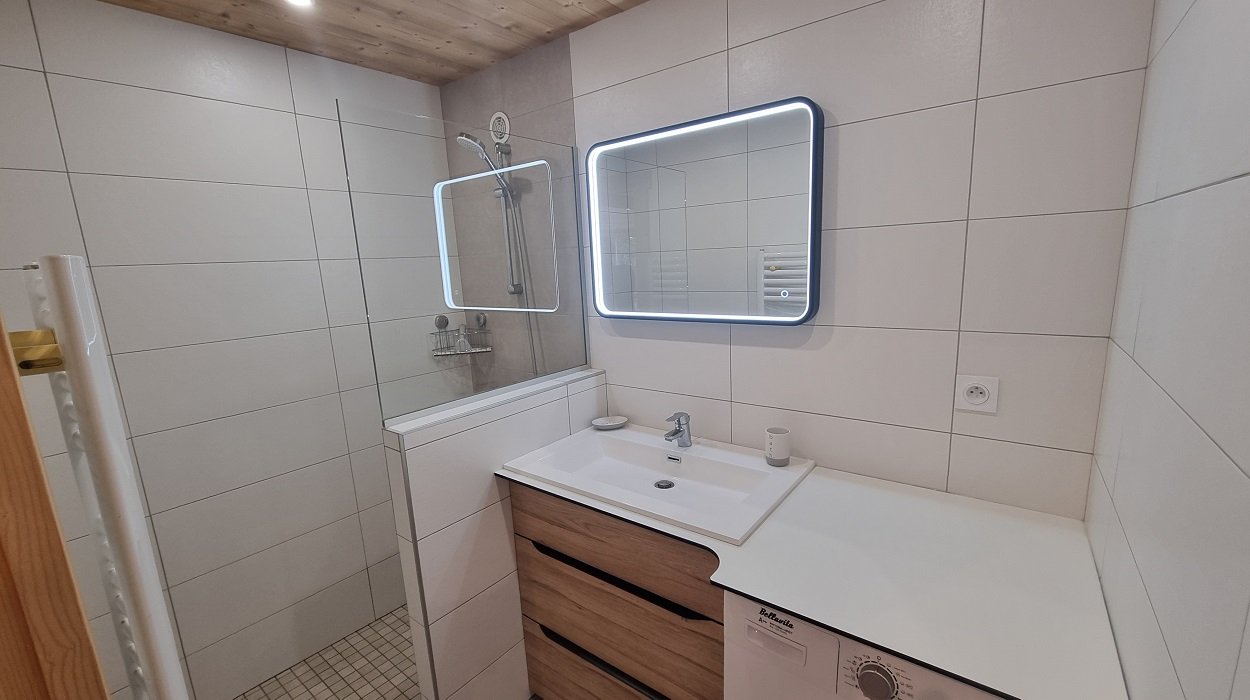 1 salle d’eau avec grande douche, sèche-serviettes, lave-linge