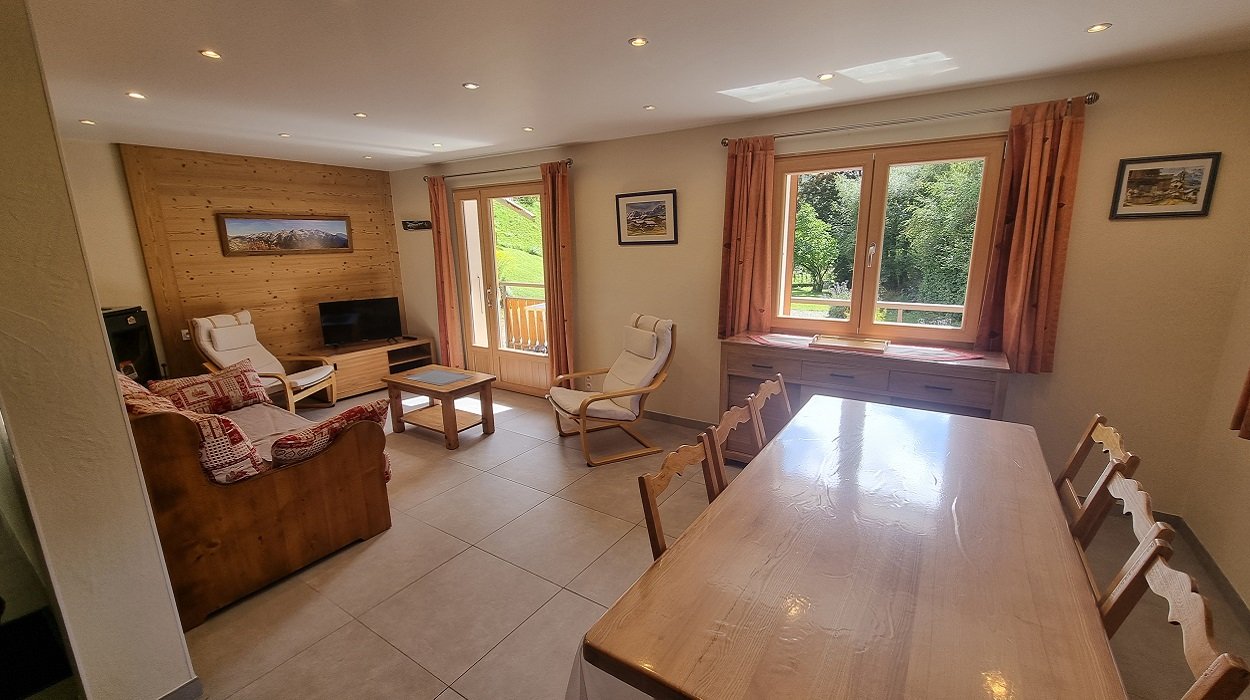Beau T3 avec vue dégagée/montagnes, à 1,3 km du centre du village, au pied des pistes et à 50 m des œufs menant au centre du village, navettes gratuites à 300m. Jardin avec jeux. Garage fermé, casier à skis. WIFI gratuit. Calme absolu, dépaysement garanti, on y revient!