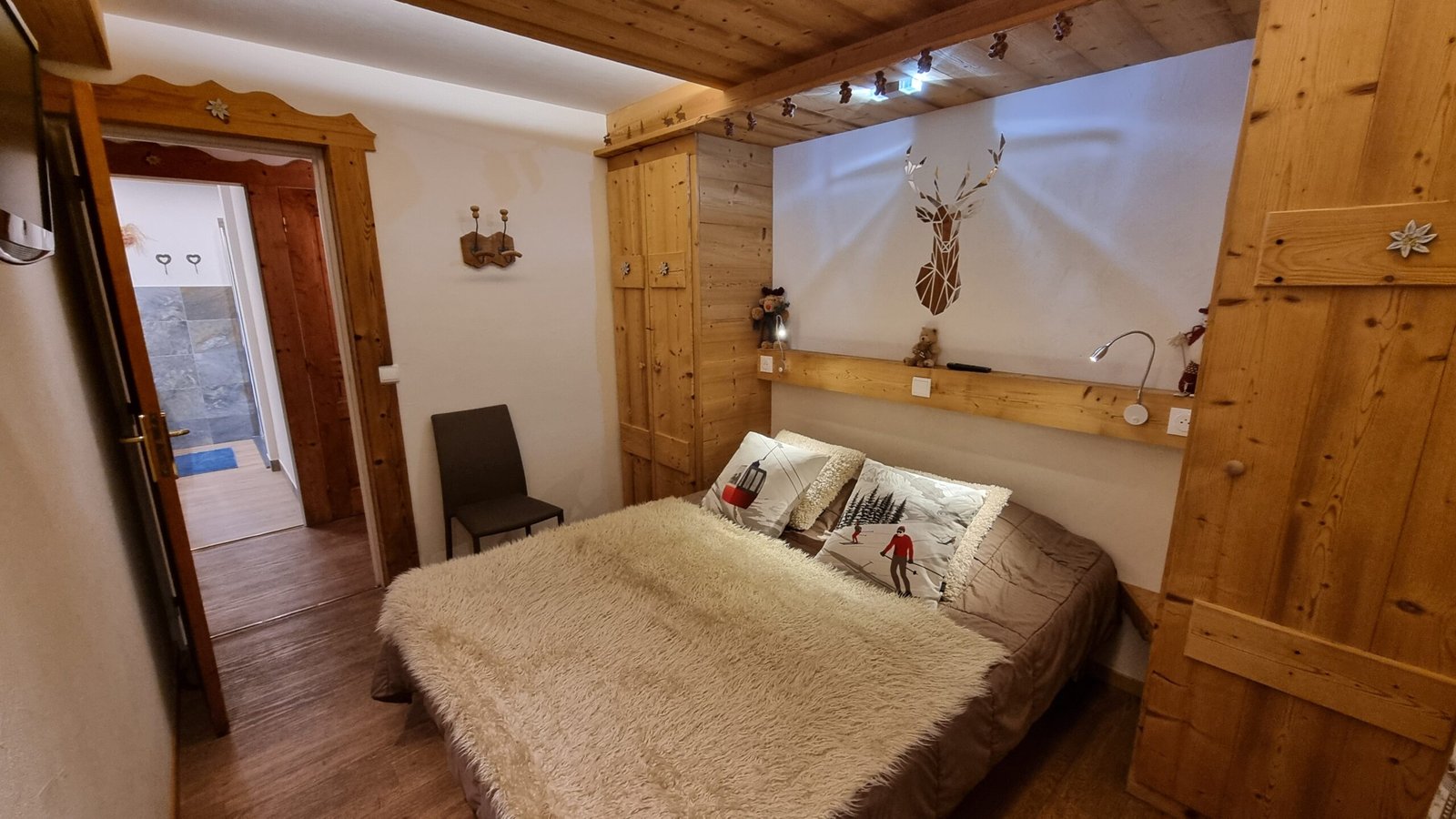 – CHAMBRE I : 10 m², 1 lit de 160×200 cm (couette 220*240 + 1 couverture) 4 oreillers 65*65, armoire penderie, placards de rangements, porte-fenêtre donnant sur balcon sud-est.