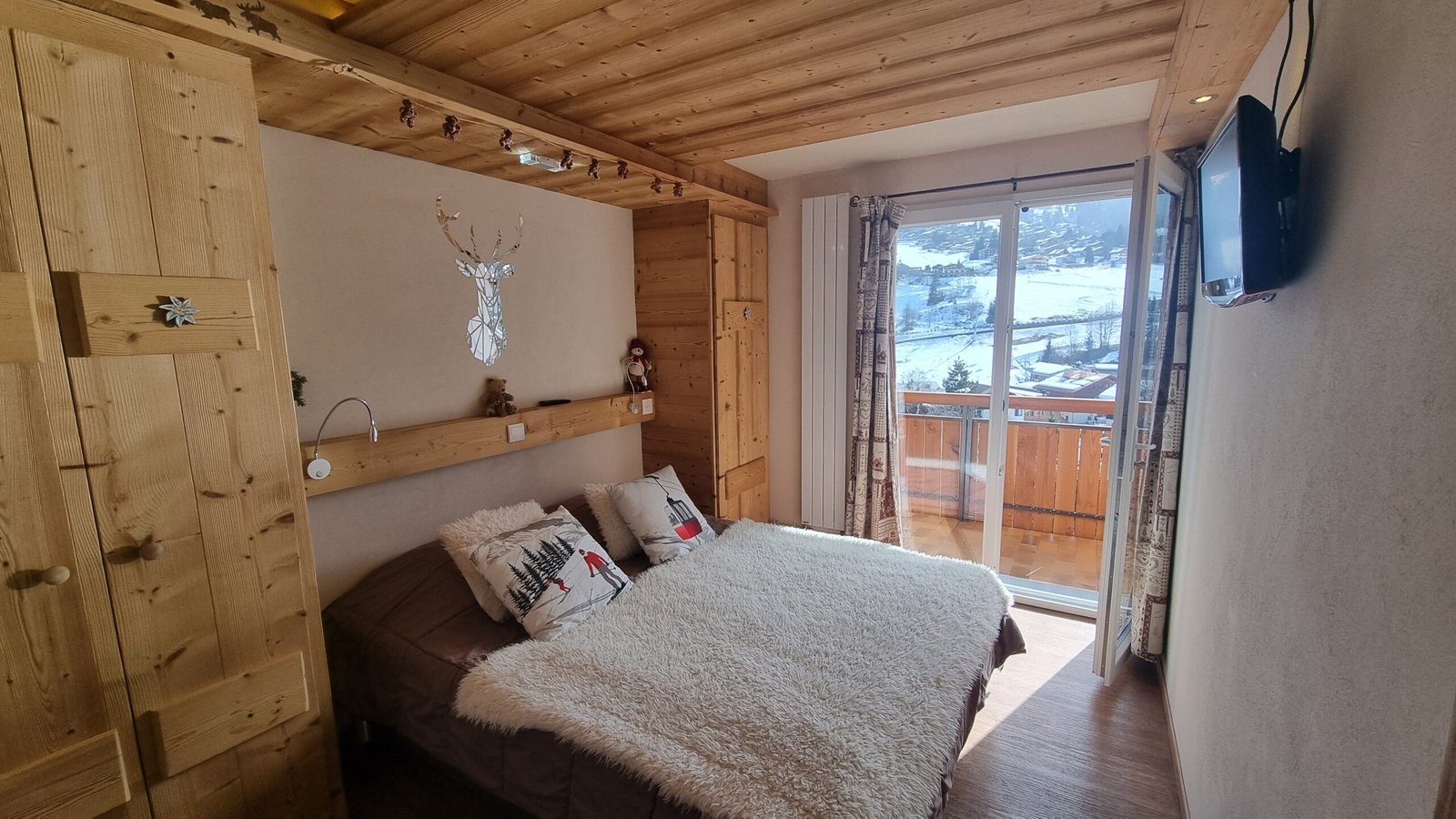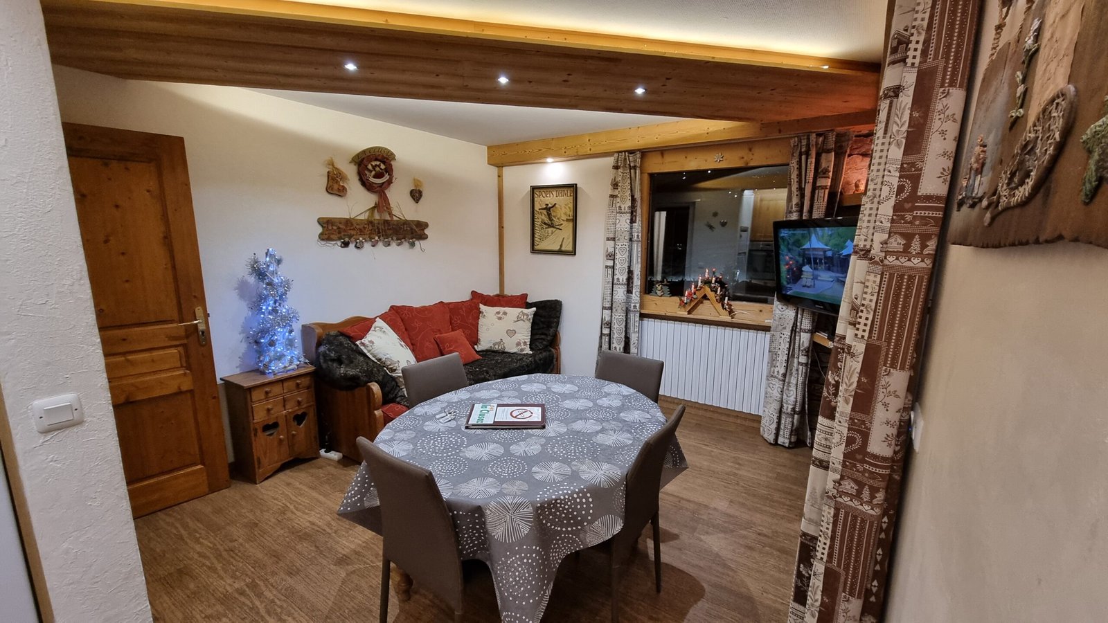 – SALLE DE SEJOUR : 20 m2, un grand canapé 3 places, fenêtre sud-est, porte-fenêtre sud-Ouest donnant sur balcon terrasse sud avec vue sur le village, la chaîne des Aravis et le massif de Beauregard. TV LCD 116cm, radio avec lecteur CD/USB.