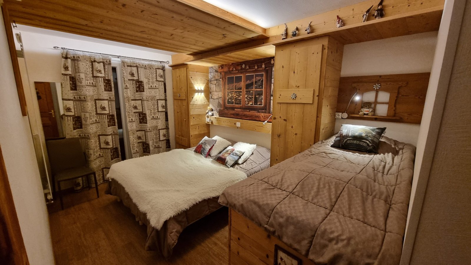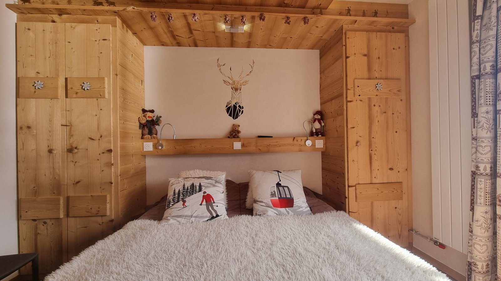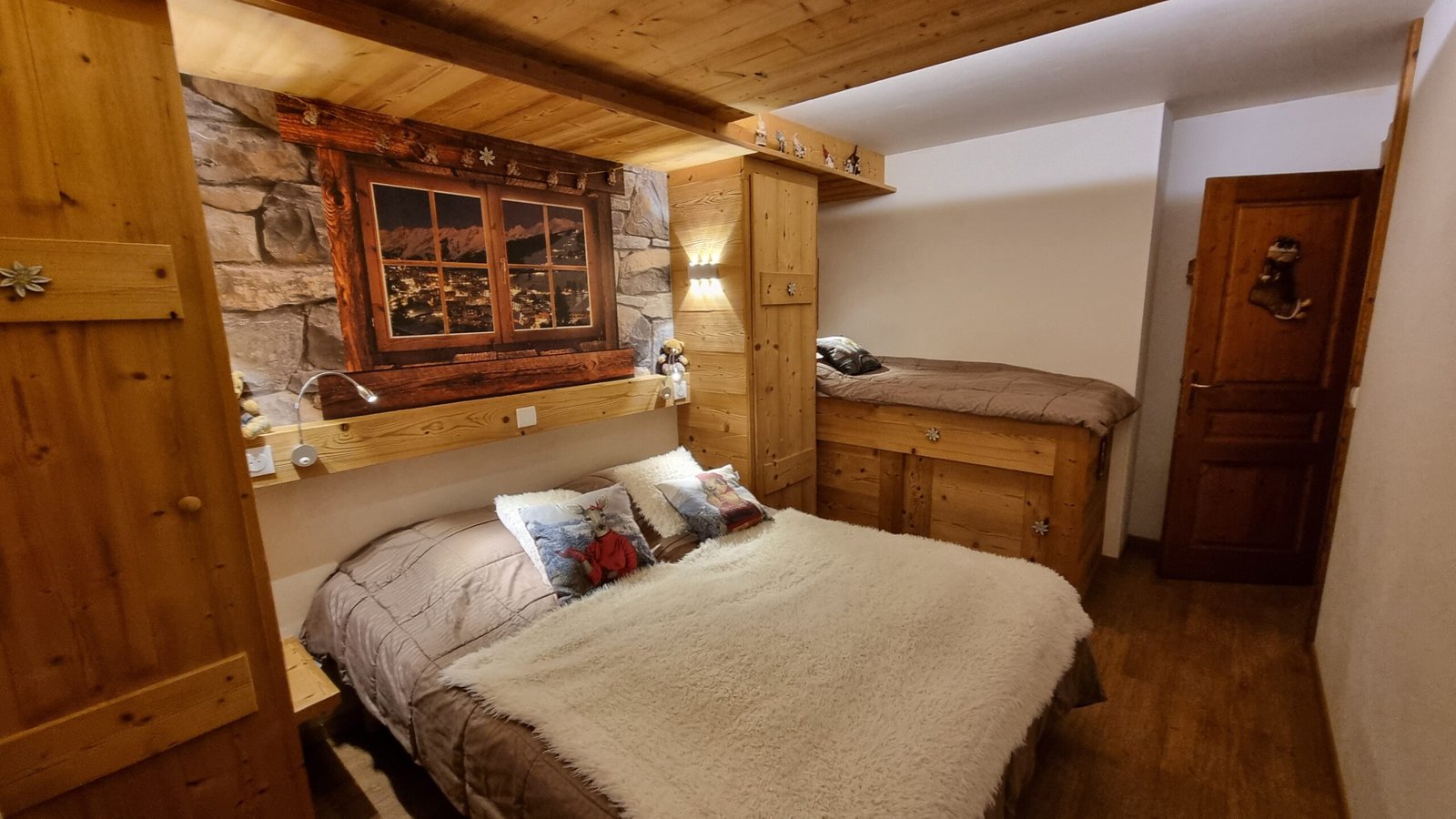 – CHAMBRE II : 12 m², 1 lit de 160×190 cm + 1 lits de 80 (1 couette 220*240 et 1 couette 140*200 + 1 couverture pour chaque lit) 6 oreillers 65*65, placards de rangement. Porte-fenêtre donnant sur Balcon Sud-Ouest.