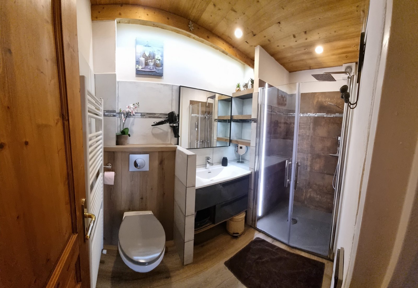 – SALLE DE BAINS 4 m² : douche de 105 * 80 cm avec 2 portes battantes, distributeur de gel douche, lavabo, meuble avec tiroirs, miroir, sèche cheveux, radiateur sèche serviette. WC suspendu