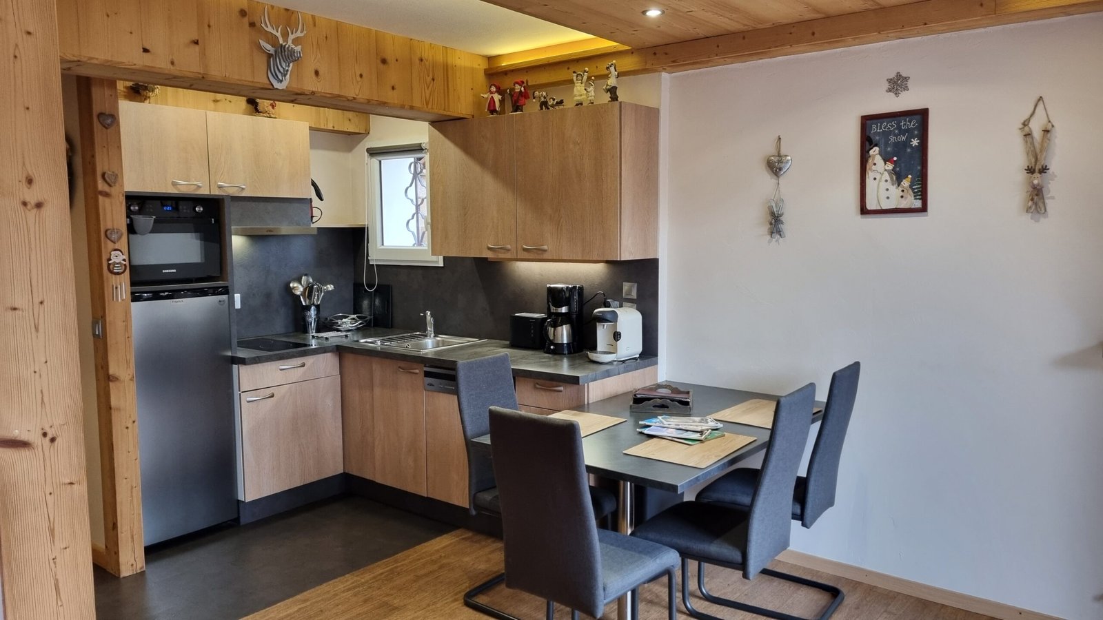 – COIN CUSINE : Cuisine intégrée, plaque 2 feux induction, four électrique multifonction, lave vaisselle, réfrigérateur avec partie congélateur, nécessaire et batterie de cuisine: vaisselle, verrerie, couverts, grille pain, cafetière électrique + expresso Tassimo, bouilloire, cocotte minute, appareil à raclette, appareil à fondue, aspirateur . . . une table avec 4 chaises