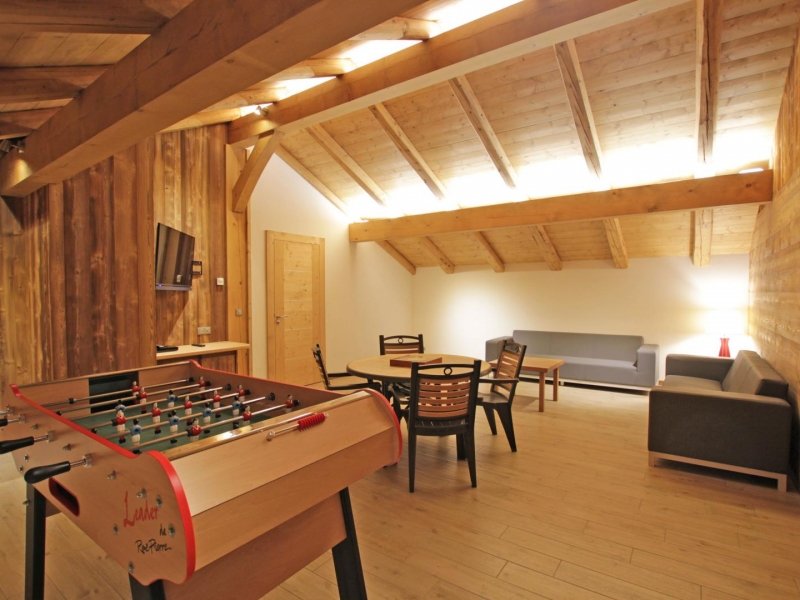 – Grande Salle de jeux sous les toits avec TV led, canapé d’angle, babyfoot, table et chaises pour jeux de carte.