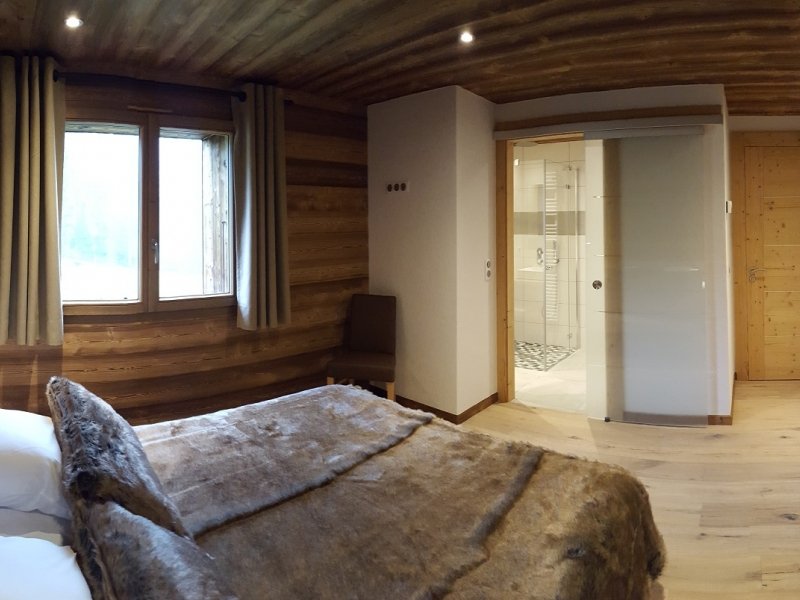 – Chambre 5 avec 1 lit de 160 x 200 et un lit de 90 x 200, salle d’eau avec douche, lavabo, radiateur sèche serviette. Une table et chaise, grande baie vitrée donnant sur la vallée et la Tournette.