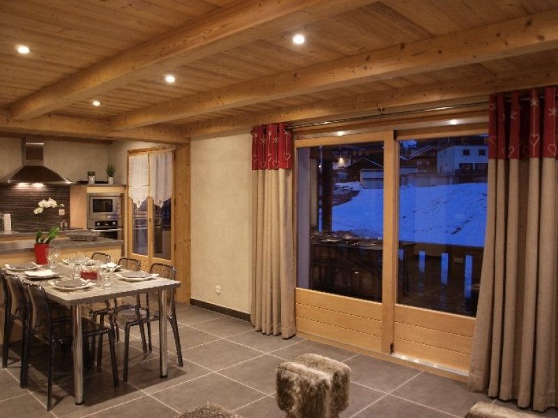 PIECE PRINCIPALE : 30M2 avec porte-fenêtre et baie coulissante donnant sur un balcon est, avec mobilier de jardin. Vue sur la chaine des Aravis.