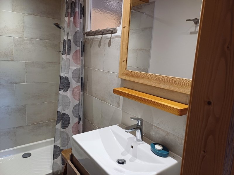 * Un salle de bain : avec une douche, lavabo, placards de rangement.