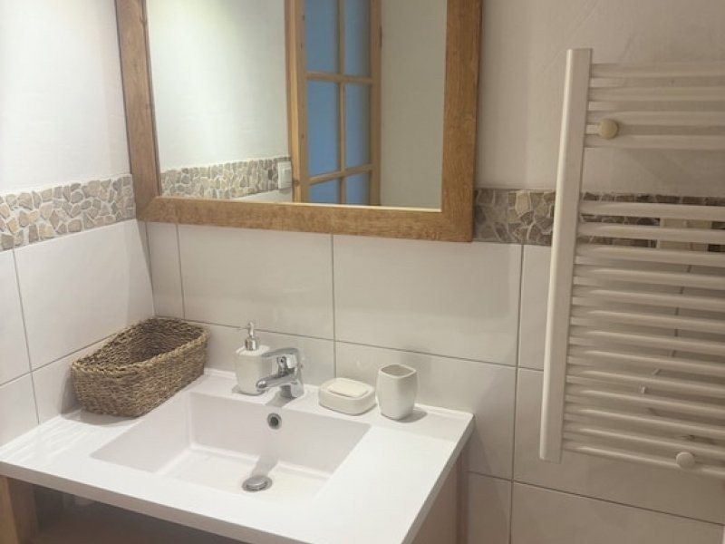 – Une salle de bain avec douche, meuble de salle de bain avec lavabo, miroir, coin WC.
