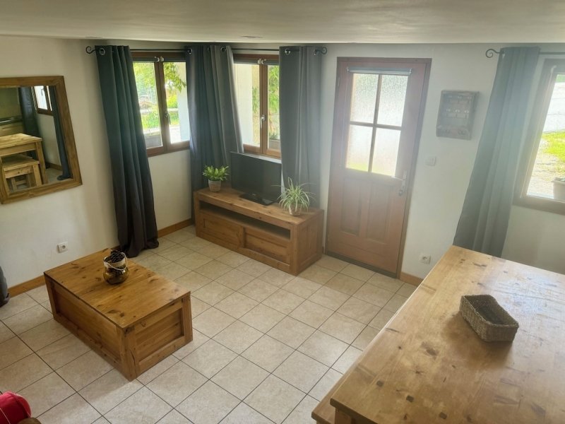 une table avec bancs, un canapé (lit gigogne 2*80, 2 fauteuils, TV écran plat, porte fenêtre Sud pour accès à l’appartement et 2 fenêtres Est et 2 fenêtres Sud.