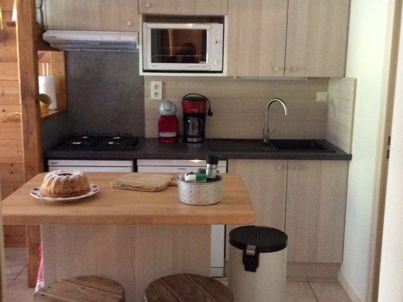 Un coin cuisine avec lave-vaisselle, four, hotte aspirante, appareil à raclette, à fondue, fer à repasser, aspirateur ……. Une fenêtre et un porte fenêtre donnant sur la terrasse Sud