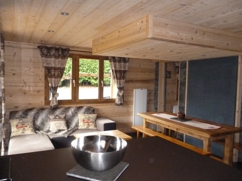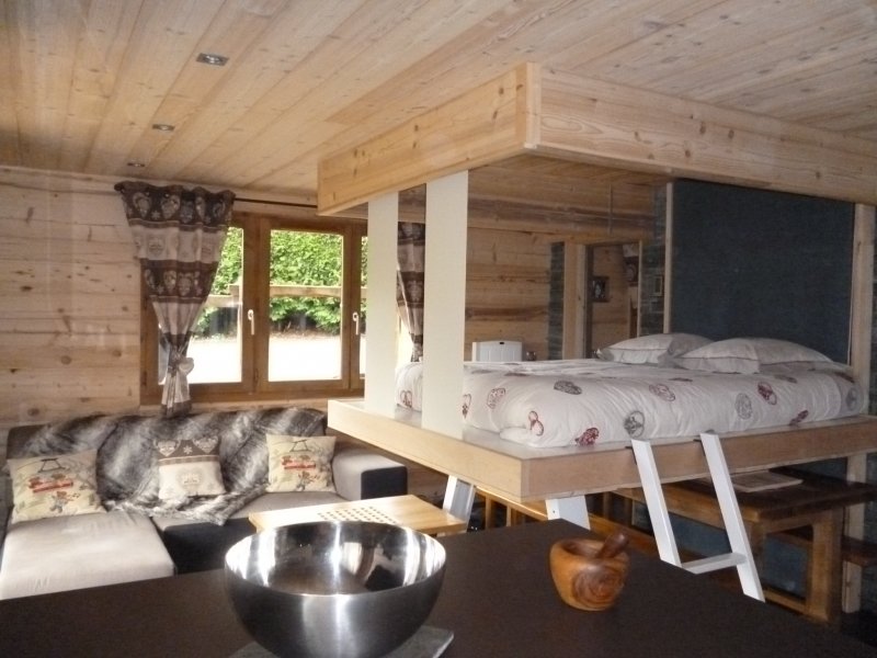 SALLE DE SEJOUR : 22 m², une banquette d’angle, baie vitrée Sud donnant sur la terrasse Sud avec vue sur le village et la chaine des Aravis. TV LCD 94 cm, Hi-Fi laser et lecteur DVD. Un lit dans le plafond de 140*190 très original et facile de fonctionnement (voir les photos)